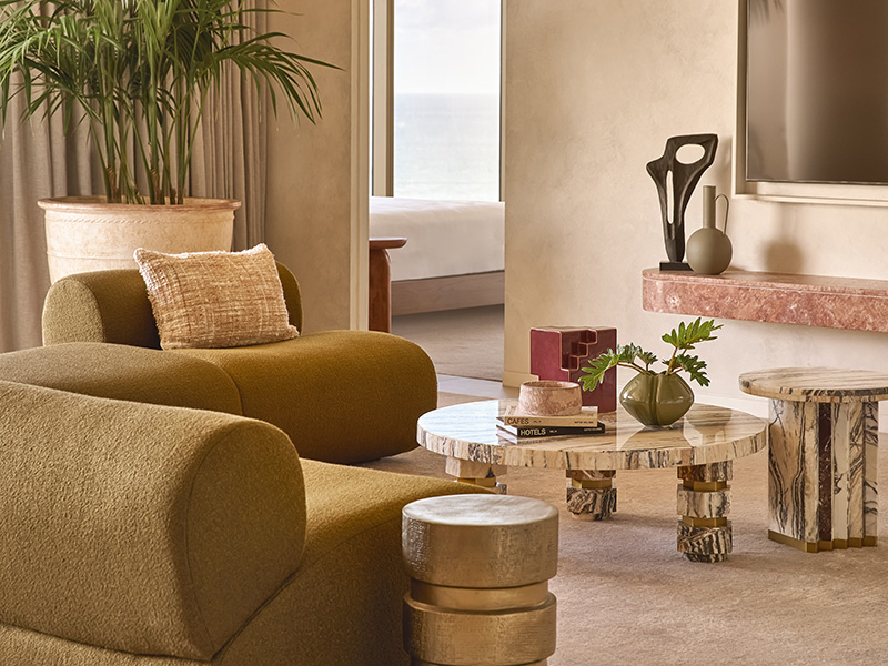 Rising between the pines and pandanus of Burleigh’s beachfront esplanade, Mondrian Gold Coast offers a design-led escape anchored by the region’s relaxed rhythm. With rooms twice the size of the national average and panoramic views across the Pacific Ocean, Burleigh Headland and the hinterland, the hotel redefines the experience of beachside accommodation. Guests can choose from 132 Studios, 63 Suites, 10 two- and three-bedroom Homes, 2 private two- and three-bedroom Beach Houses with plunge pools, and the spectacular Sky House crowning the 24th floor — all designed by California-based Studio Carter.