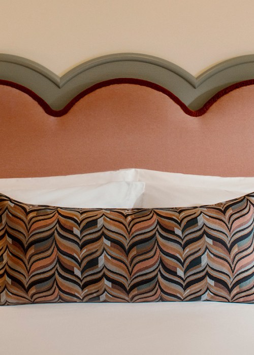 Each of the 234 bedrooms is defined by Art Nouveau forms and expressive design details, inspired by the classical structures which inform the neighbourhood’s architectural landscape. A muted colour palette of desaturated pinks and greens creates a sophisticated backdrop for vintage-inspired furniture and scalloped headboards, with the shell motif recurring in striking rug patterns and elegant glass wall lights. Wall panelling and wooden herringbone flooring provide a structural counterpoint to the soft fluidity of the rooms, and this juxtaposition extends to the bathroom design where exposed metal shelving is set against graduated mauve tiling.