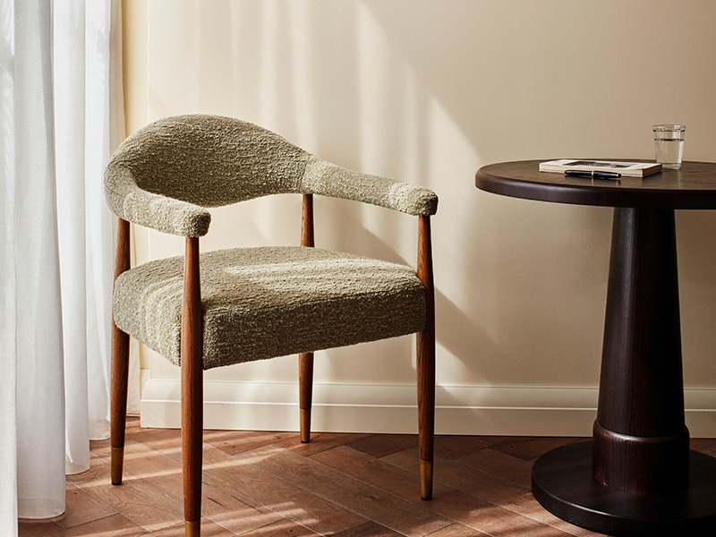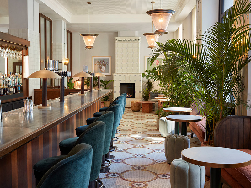 Blue and green tones inform the colour palette of the bright and airy lobby, which is dotted with mid-century furniture sourced from Northern Europe, bespoke rugs, referential Bauhaus artwork, set under striking Murano glass chandeliers. A central wraparound bar leads to an intimate Winter Garden, the perfect spot to pull up a bar stool for post-work cocktails or cosy down next to the Delft-inspired tiled fireplace for a quick snifter as the evenings draw in.